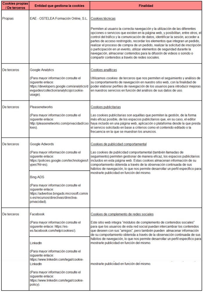 Son aquéllas que permiten al usuario la navegación a través de una página web, plataforma o aplicación y la utilización de las diferentes opciones o servicios que en ella existan como, por ejemplo, controlar el tráfico y la comunicación de datos, identificar la sesión, acceder a partes de acceso restringido, recordar los elementos que integran un pedido, realizar el proceso de compra de un pedido, realizar la solicitud de inscripción o participación en un evento, utilizar elementos de seguridad durante la navegación, almacenar contenidos para la difusión de videos o sonido o compartir contenidos a través de redes sociales.